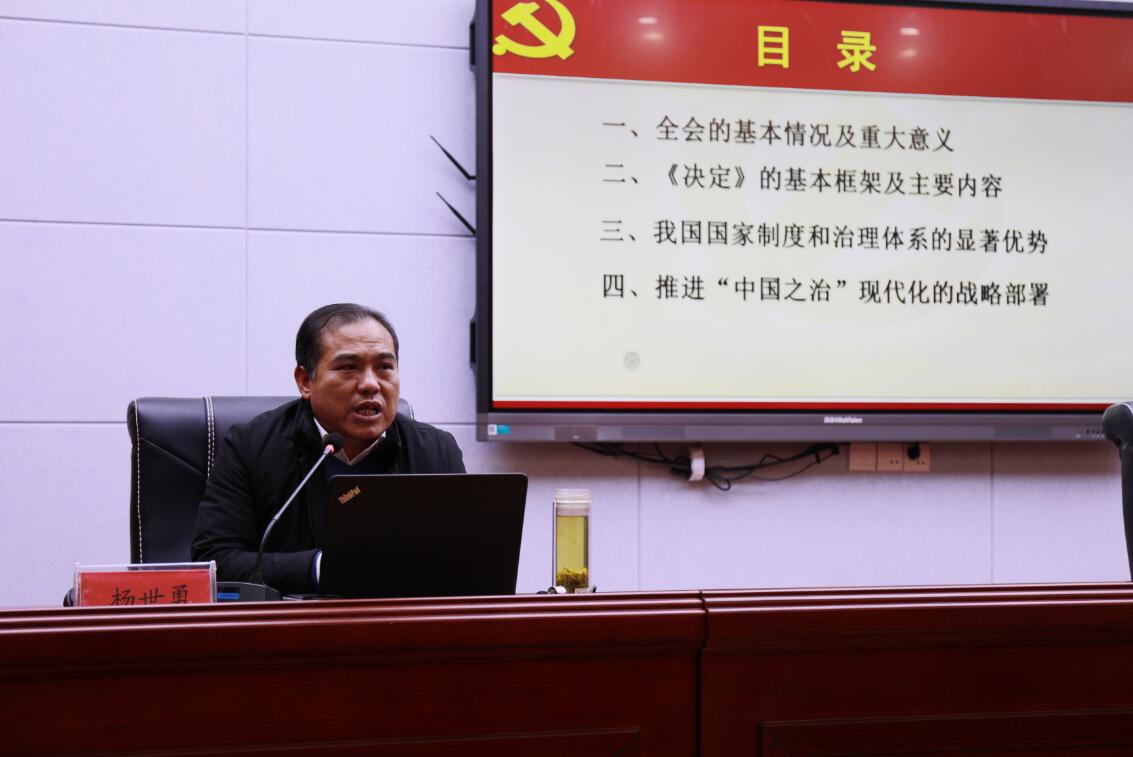 杨世勇教授从全会的基本情况及重大意义、《决定》的基本框架及主要内容、中国特色社会主义制度的显著优势、推进“中国之治”现代化的战略部署四个方面,对党的十九届四中全会精神进行了深入浅出、全面系统的宣讲。