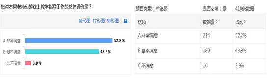一是汽车学院、医学院通过线上调查做好学生服务。2月22日,汽车学院教学办利用“金数据“网络工具开展了第一周线上教学工作情况学生调查问卷,就线上“教学资源、教学组织、作业批改“等方面进行了网络问卷调查。问卷以链接方式发到各班级群,由班委会组织班级学生客观实际做出评价。通过金数据问卷统计,总共收到410条问卷信息,占在线学习学生总数的73%。通过学生评价信息反馈,大部分老师都能按时布置课堂学习任务,批改作业,组织课堂教学。2月25日,医学院教学办利用“问卷星”平台,针对学生网络环境,教师线上授课组织形式、线上教学效果满意度等方面制成问卷,共收回问卷212份,占学生总数81.5%。通过学生评价信息反馈,学生最喜爱的是钉钉直播平台。根据问卷调查,教师及时调整教学模式,做到精准服务。