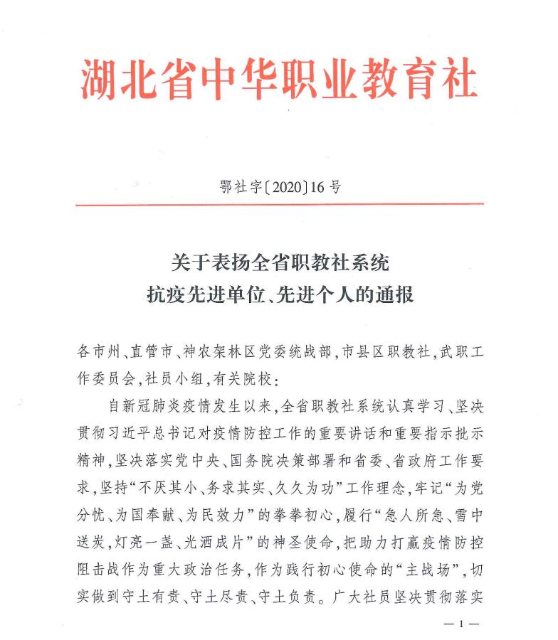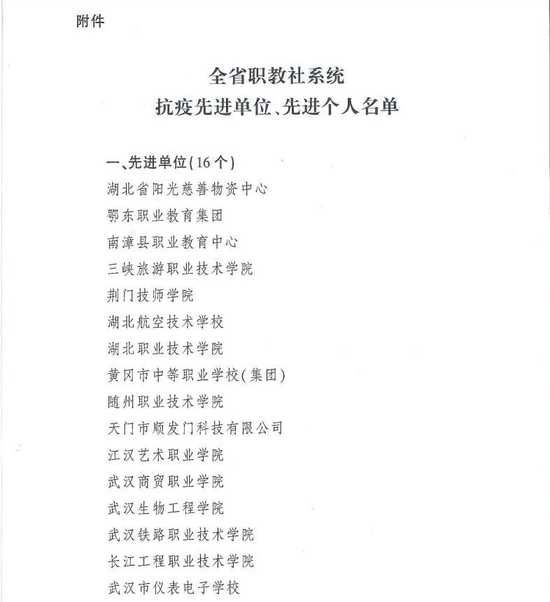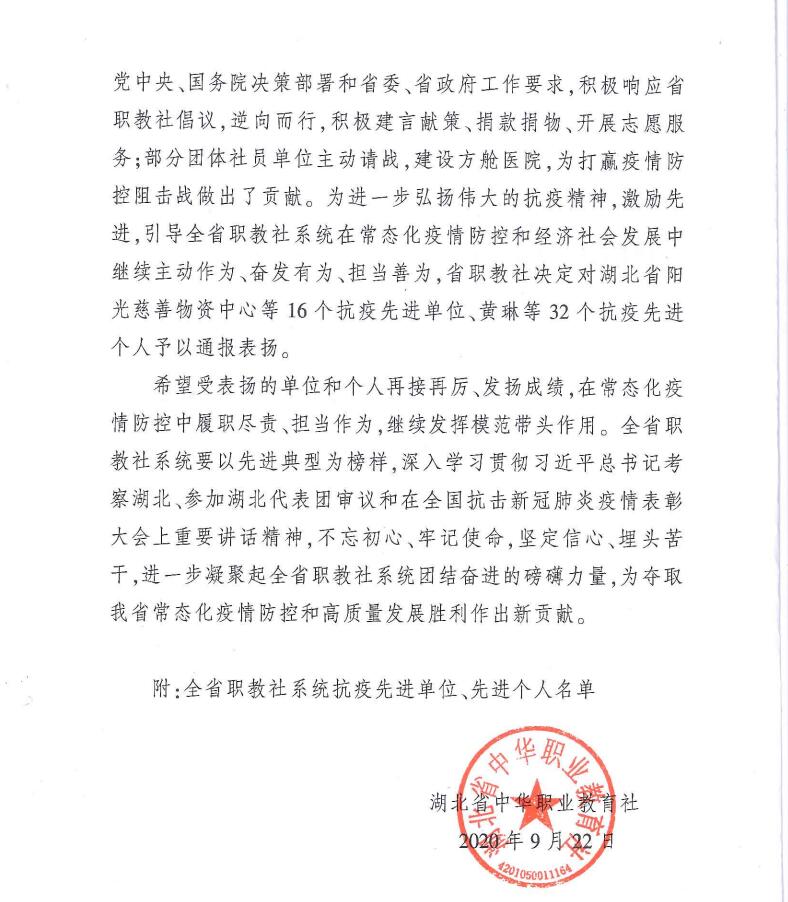 本网讯 记者张亦飞报道 10月28日,从湖北省中华职业教育社传来喜讯,我院获“全省职教社系统抗疫先进单位”称号,据悉,全省共有16个职业院校获此表彰。