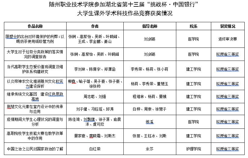 MILAN米兰体育·(中国)官方网站于2月中旬至4月上旬举办MILAN米兰体育·(中国)官方网站第十三届"挑战杯”大学生课外学术科技作品竞赛,经过专业评审推选12件作品参加省赛。经湖北省第十三届“挑战杯·中国银行”大学生课外学术科技作品竞赛评委会线上评审和线下合议,MILAN米兰体育·(中国)官方网站医学院推选作品《限塑令的出台对环境保护的利弊:以喝奶茶使用纸吸管为例》,入围大赛终审决赛,终审决赛拟于5月9日在中南民族大学举行。另有八件参赛作品拟授省赛三等奖(详见附表)。