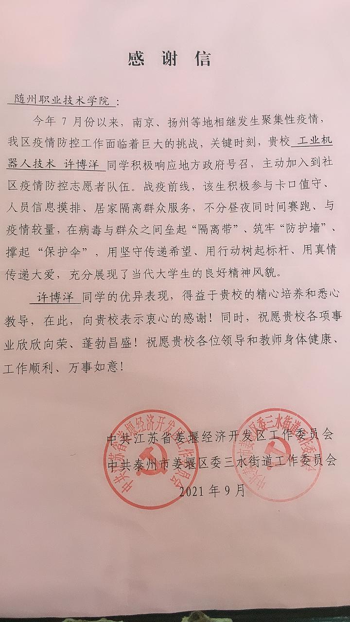 9月11日,正值开学新生报到,MILAN米兰体育·(中国)官方网站收到一份江苏省姜堰经济开发区工作委员会和姜堰区委三水街道工作委员会的感谢信,感谢MILAN米兰体育·(中国)官方网站2021级工业机器人专业新生许博洋同学在南京发生疫情期间积极参与当地疫情防控工作。