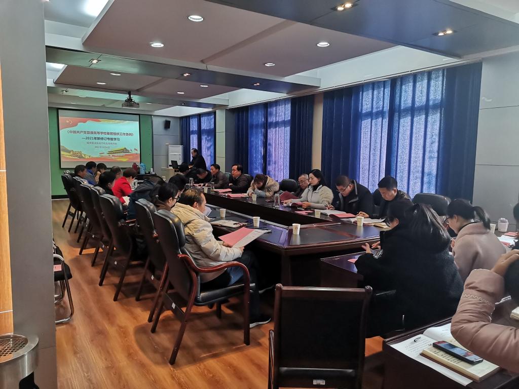 12月6日,学校在行知楼208会议室召开《中国共产党普通高等学校基层组织工作条例》(以下简称《条例》)专题学习培训。校党委委员、副院长梁学军,学校各党总支(直属支部)书记、副书记,各支部书记、党总支组织员参加此次专题培训。