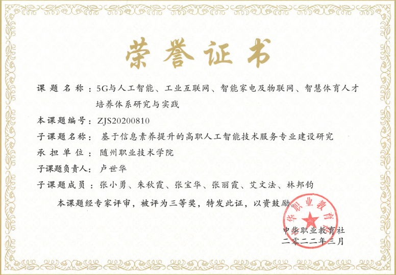 近日,从中华职业教育社传来喜讯:由MILAN米兰体育·(中国)官方网站卢世华老师主持的中华职教社课题《基于信息素养提升的高职人工智能技术服务专业建设研究》(课题编号:ZJS20200810),经中华职教社课题评审委员会评审顺利结题,并荣获三等奖,实现了MILAN米兰体育·(中国)官方网站国家级研究课题结题并获奖的新突破,为学校争得了荣誉。