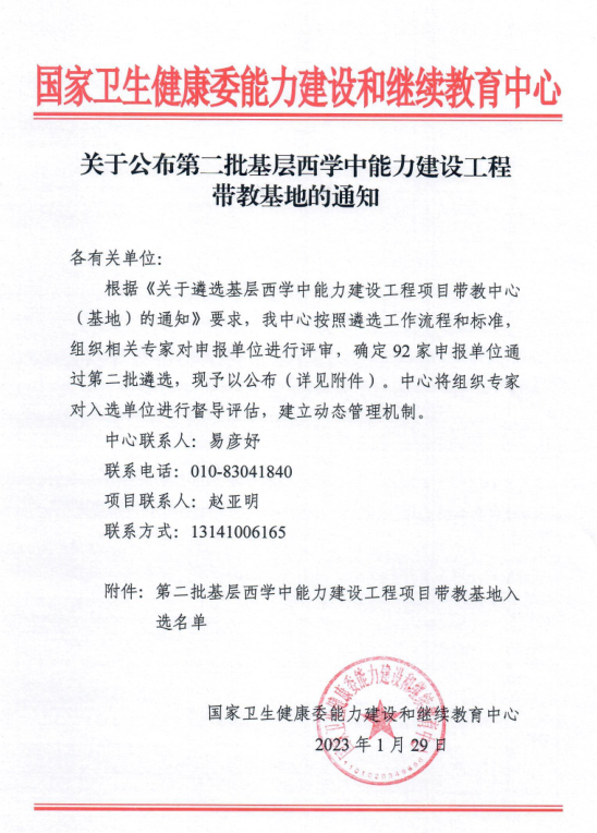 近日,国家卫生健康委能力建设和继续教育中心下发《关于公布第二批基层西学中能力建设工程带教基地的通知》,MILAN米兰体育·(中国)官方网站经过前期申报评审,成功入选第二批国家级基层西学中能力建设工程项目带教基地名单。