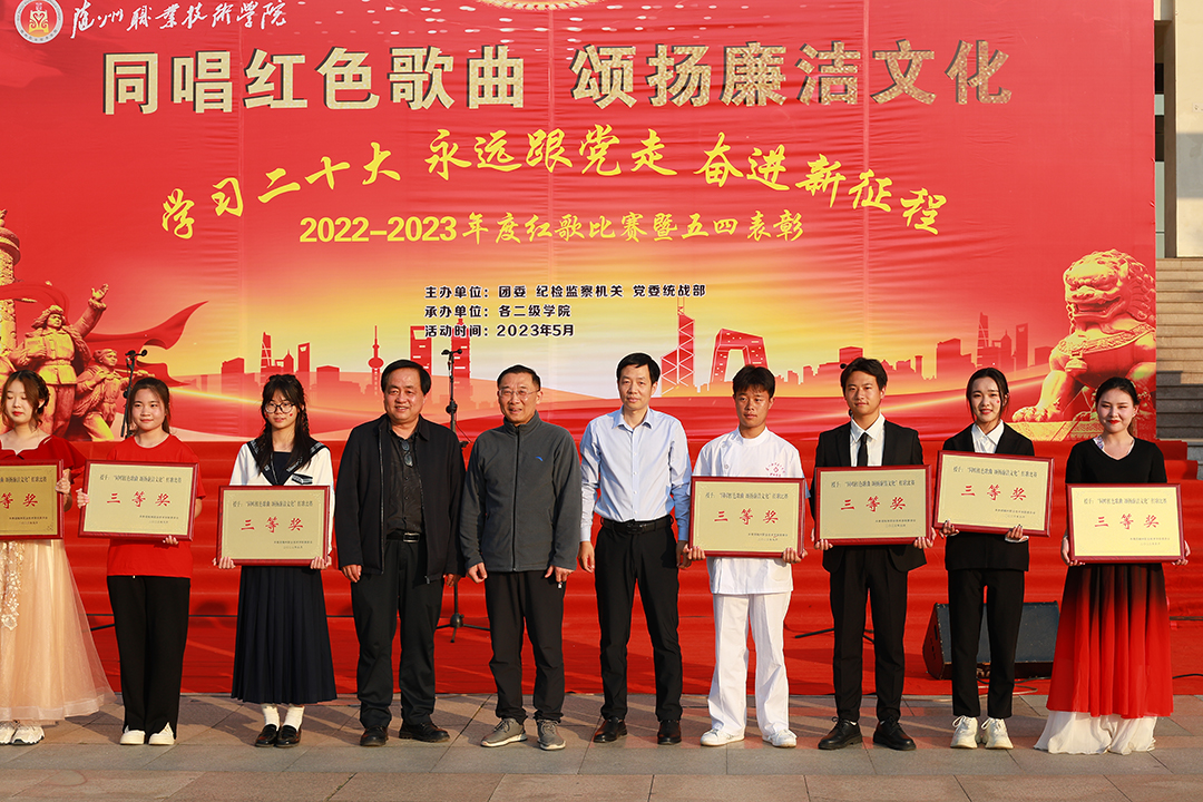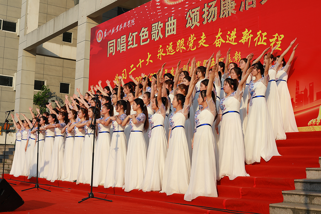 此次活动由校团委、纪检监察机关、党委统战部主办,8个二级单位承办。首场一曲《映山红》如天籁之音,深情婉转,回荡在校园编钟广场上,接着各参赛队伍着装统一、朝气蓬勃地演唱了《天耀中华》《灯火里的中国》《万疆》《不忘初心》《唱支山歌给党听》《没有共产党就没有新中国》等歌曲,用歌声深情地表达了自己对盛世中华的赞美,抒发了青年学子对党、对国家、对人民的赤子情怀。守正创新、各具特色的演唱彰显着浩然正气,赢得了现场一阵又一阵的掌声,掀起了活动一个又一个的高潮。经过激烈的角逐,最终服装与艺术设计学院团总支和专用汽车学院团总支斩获一等奖,医学院、建工学院、护理学院团总支获得二等奖,信息工程学院、旅游与经济管理学院、香菇学院获得三等奖。
