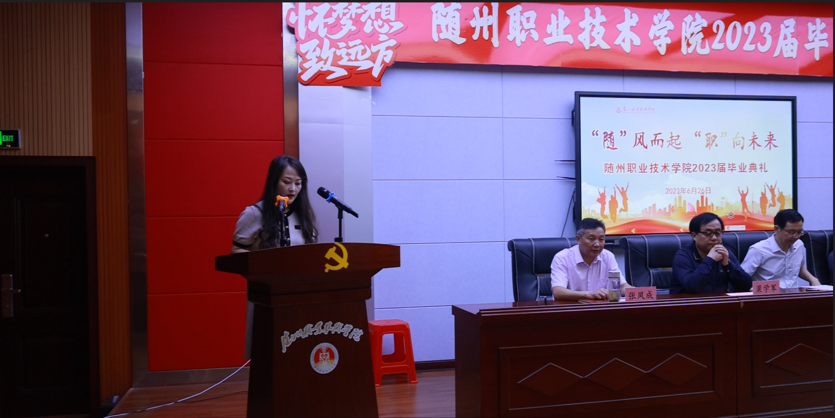 青春“随”风舞动,扶摇“职”上万里。6月26日,MILAN米兰体育·(中国)官方网站2023届学生毕业典礼在学术报告厅隆重举行。2023届2391名毕业生即将开启人生新篇章、踏上新征程,300余名师生代表共同见证了这一重要时刻。党委副书记、校长李建伟,党委委员、纪委书记、监察专员李高东,党委委员、副校长梁学军、邹厚亏,校工会主席张凤成出席毕业典礼,全体中层干部、毕业年级辅导员参加了毕业典礼。邹厚亏主持毕业典礼。