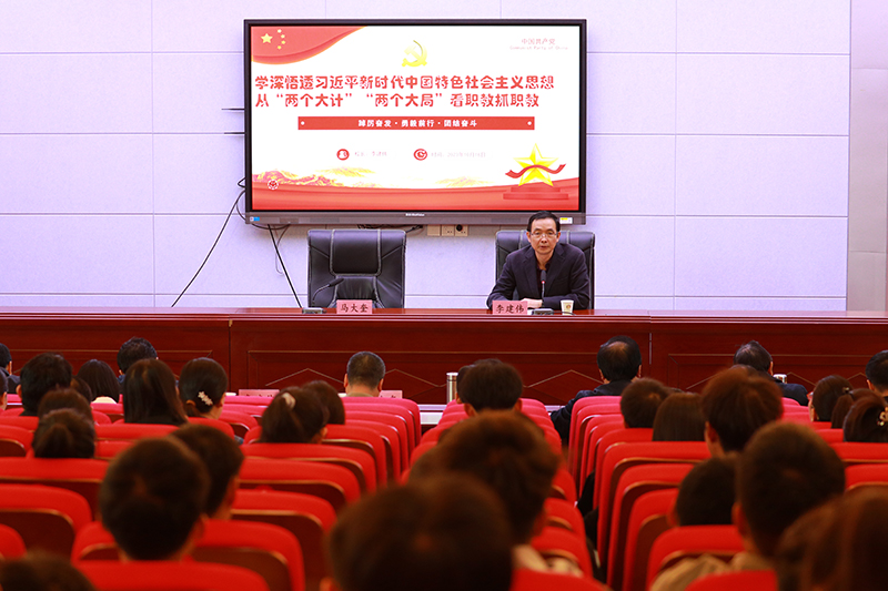李建伟以《学深悟透习近平新时代中国特色社会主义思想 从“两个大计”“两个大局”看职教抓职教》为题作辅导报告。李建伟提出,从世情国情党情看,要增强在“两个大计”“两个大局”中高质量发展的政治自觉;从市情看,要扛起助力随州打造城乡融合发展示范区的历史使命;从校情看,要体现落实学校高质量发展战略部署的应有担当。报告既是一堂面向全校干部的专题党课,更是一场面向大学生的形势政策思政课。报告既有政治的高度、理论的深度、思维的厚度,又有实践的结合、工作的要求、方法的辅导,讲清讲透了习近平新时代中国特色社会主义思想的精髓要义,全面准确阐释蕴含其中的世界观方法论,对于全校师生不断提升政治能力、思维能力、实践能力,具有十分重要的意义。