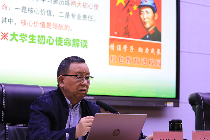 省直机关关工委“五老”报告团成员、武汉大学教授周运清在报告会上作了以“传承毛泽东精神品格塑造大学生核心价值”为题的宣讲,他以“弘扬毛泽东伟大精神品格,塑造新时代大学生核心价值”为主线,紧紧围绕当代大学生“厚植核心价值、履行专业责任”两大初心使命和“学什么、为什么学、怎样学”三大现实命题,为学生上了一堂理论深厚、精神丰厚、情感醇厚的思想政治教育课。