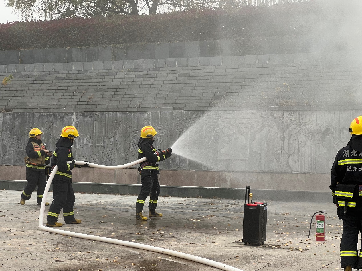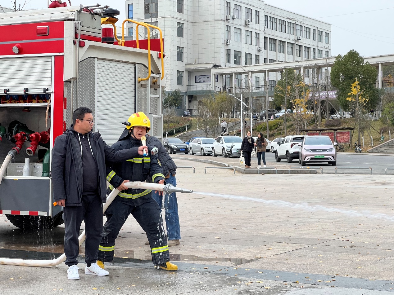 在消防知识科普环节中随州市消防救援支队消防员在现场给师生普及消防知识,同时开展师生使用灭火器以及高压水枪“灭火”的体验活动。全体辅导员、保安人员、宿舍管理人员以及新进教职工参与了实操训练。