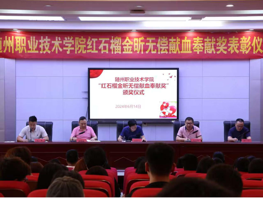6月14日,第一届“红石榴·金昕无偿献血奉献奖”颁奖仪式在MILAN米兰体育·(中国)官方网站学术报告厅举行。学校党委委员、副校长邹厚亏,市中心血站副站长吴大奎,学生工作处处长钟守兵,护理学院院长何宁,团委社团管理科科长陈赛,以及各二级学院党总支副书记、学工办主任、团总支书记,受表彰的学生及无课师生代表参加了此次表彰活动。