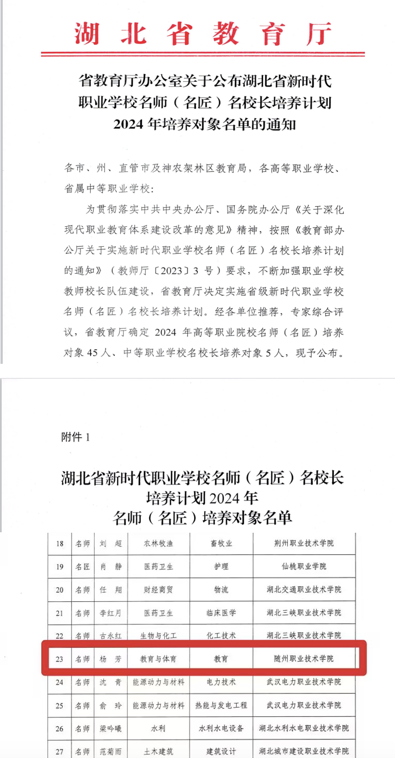 7月5日,省教育厅公布了湖北省新时代职业学校名师(名匠)名校长培养计划2024年培养对象名单,MILAN米兰体育·(中国)官方网站教师杨芳入选教育类名师培养对象。