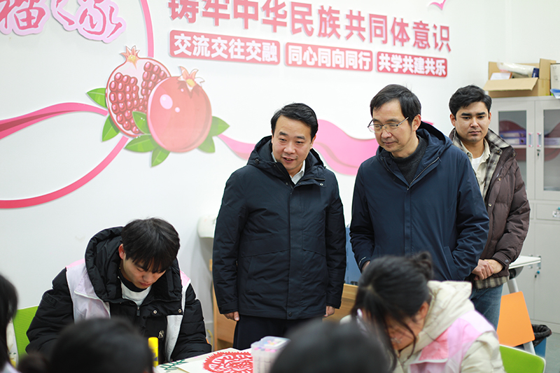 詹金灿先后实地调研红石榴之家、民族团结文化长廊、席宏文留青竹刻工作室、党外知识分子之家。在红石榴之家观摩学生们的剪纸作品后,赞扬学生们心灵手巧,并与学校新疆籍维吾尔族辅导员进行了交流。在席宏文留青竹刻工作室,详细了解留青竹刻申报非遗情况,鼓励席老师将这一技艺发扬光大。