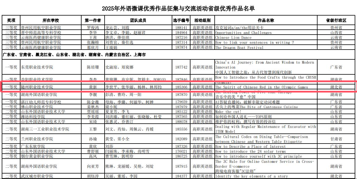 本次大赛于2025年3月启动,涵盖本科英语、高职英语和多语种三个赛道,采用多省合组评审方式。在包含广东省、甘肃省、黑龙江省、山东省、湖北省、湖南省、内蒙古自治区和上海市等八省市的小组评审中,共评出一等奖6名、二等奖10名、三等奖13名。