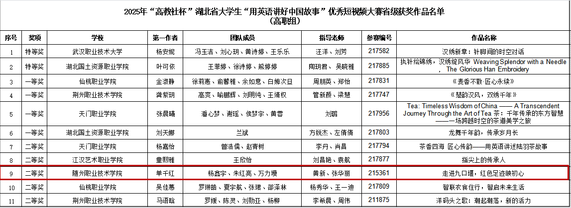 该获奖作品由学生团队赴随州市曾都区洛阳镇红色革命基地九口堰进行现场拍摄、取景、制作及全英文配音完成,以独特的视角和生动的语言讲述了当地的红色故事,展现了青年一代对革命精神的传承与弘扬。