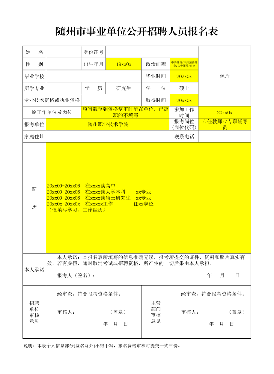 2.《随州市事业单位公开招聘人员报名表》填写模版